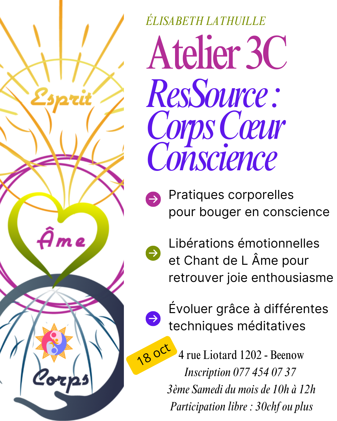 Vient découvrir le potentiel qui est en toi ! Pour cela 3 étapes : Expérience de la conscience du corps grâce à une pratique corporelle Le chant de l'âme : souffle et voix Approche du Soi divin au travers de méditations 1er Novembre :